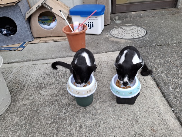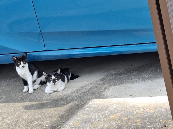 2匹ともクロ、シロのブチ猫です。一匹は顔がクロとシロの八割れのため「八チ」と名付け、雄はそのまま「ボク」です。境内で名前を呼んで戴いて、近くにいれば、人懐こい「ハチ」は出て来て、スリスリ、ナデナデ、お尻ポンポン大好きです。「ボク」は送れてきて、やや遠くで様子見てます。猫好きの方はどうぞ可愛いがってやって下さい。