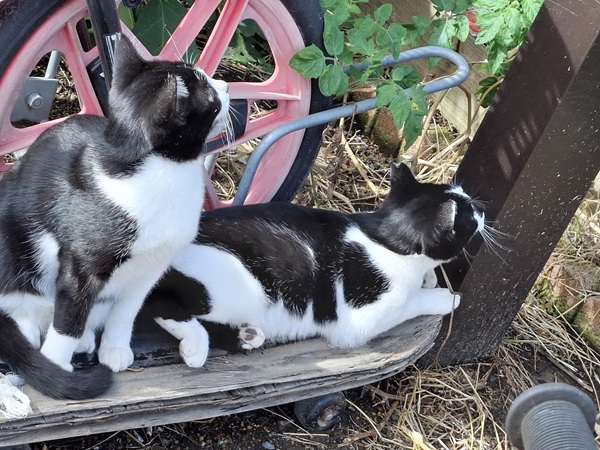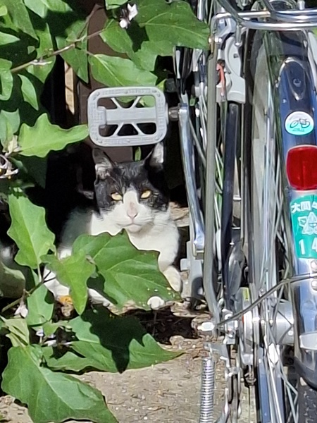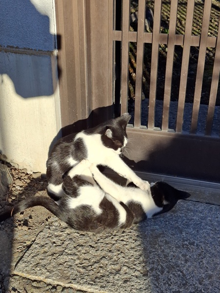境内では、2匹の仔猫が元気に飛び回わり、母猫と、知らない内に新しい少し大きめのクロハチ猫が来るようになり、計4匹が一緒に見られる時があります。おとなしいので仔猫と一緒昼寝してる時もあります。これからどうなるのか、不安もあり、癒される時もあありで、しばらく様子見です。