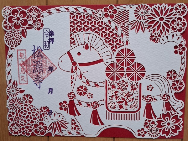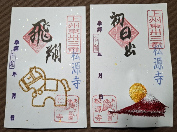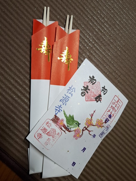 縁起の御朱印(刺繍初日の出、鶯、切り絵馬等)と祝箸(500円以上お納めの方に進呈)をご用意させていただいております。