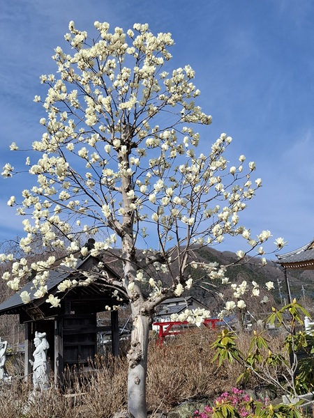 春の彼岸も終わり、気温も上昇。松源寺も春の花が咲き始め、白蓮、しだれ桜、ソメイヨシノと本格的な、